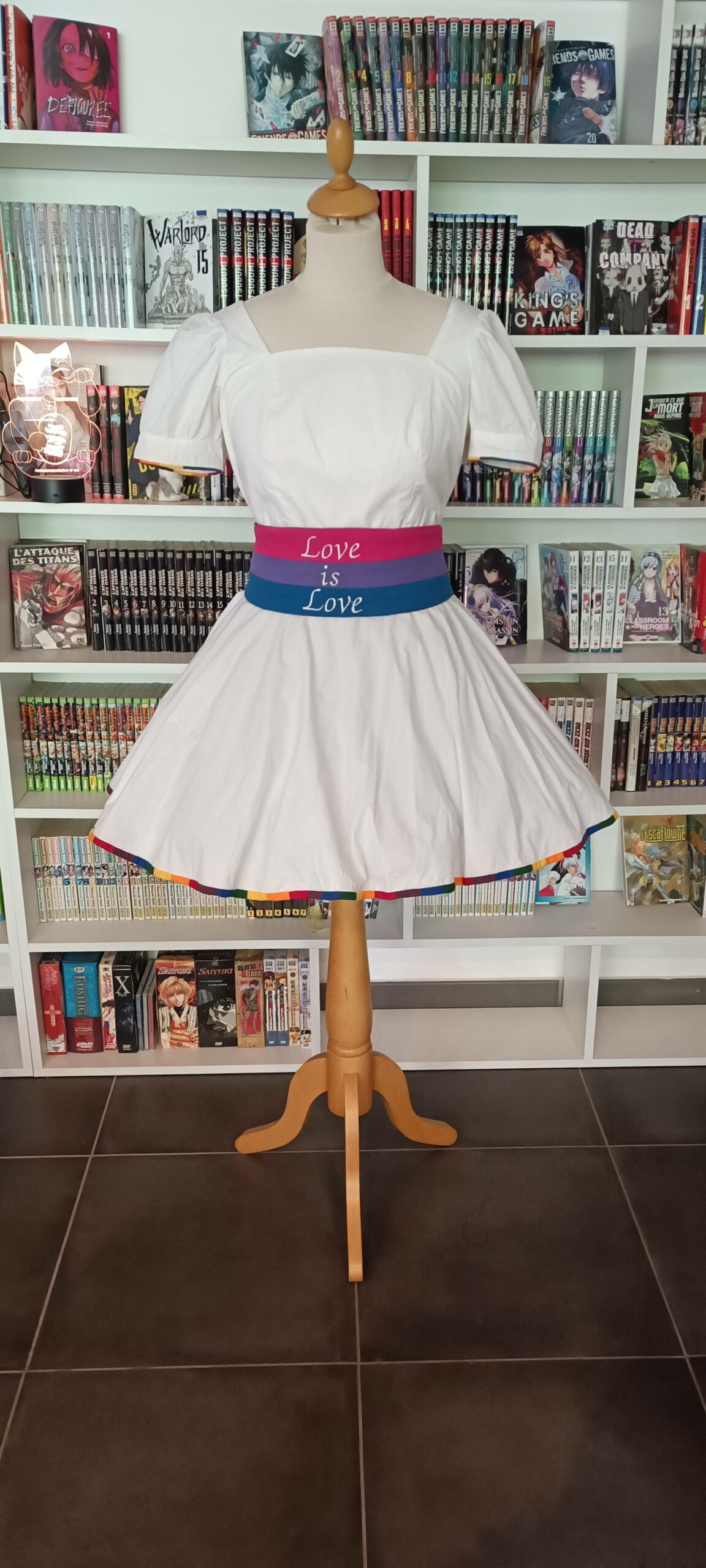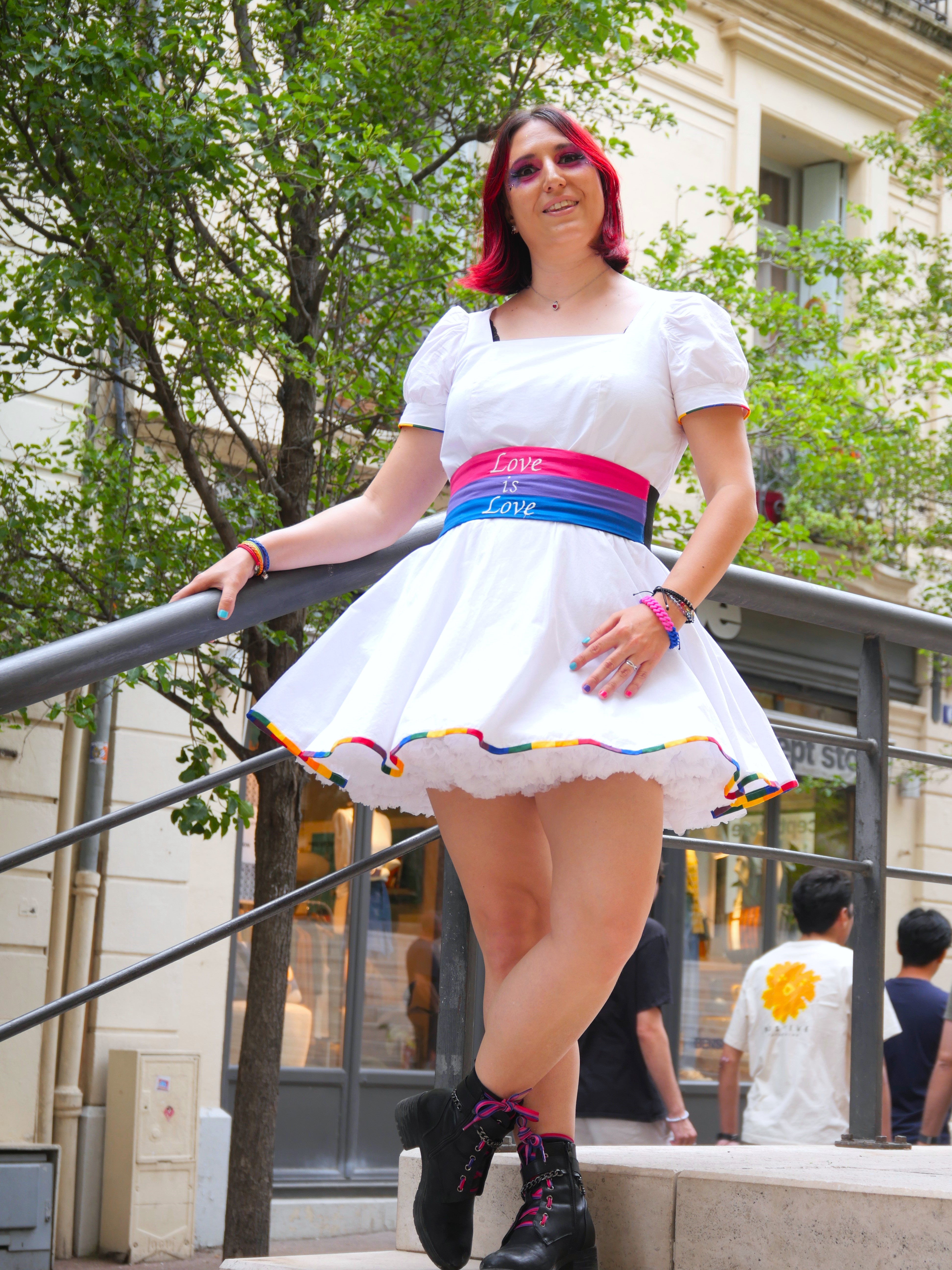 • Détails iconiques : Des liserés aux couleurs du drapeau LGBTQIA+ qui soulignent délicatement les manches et le bas de la robe.